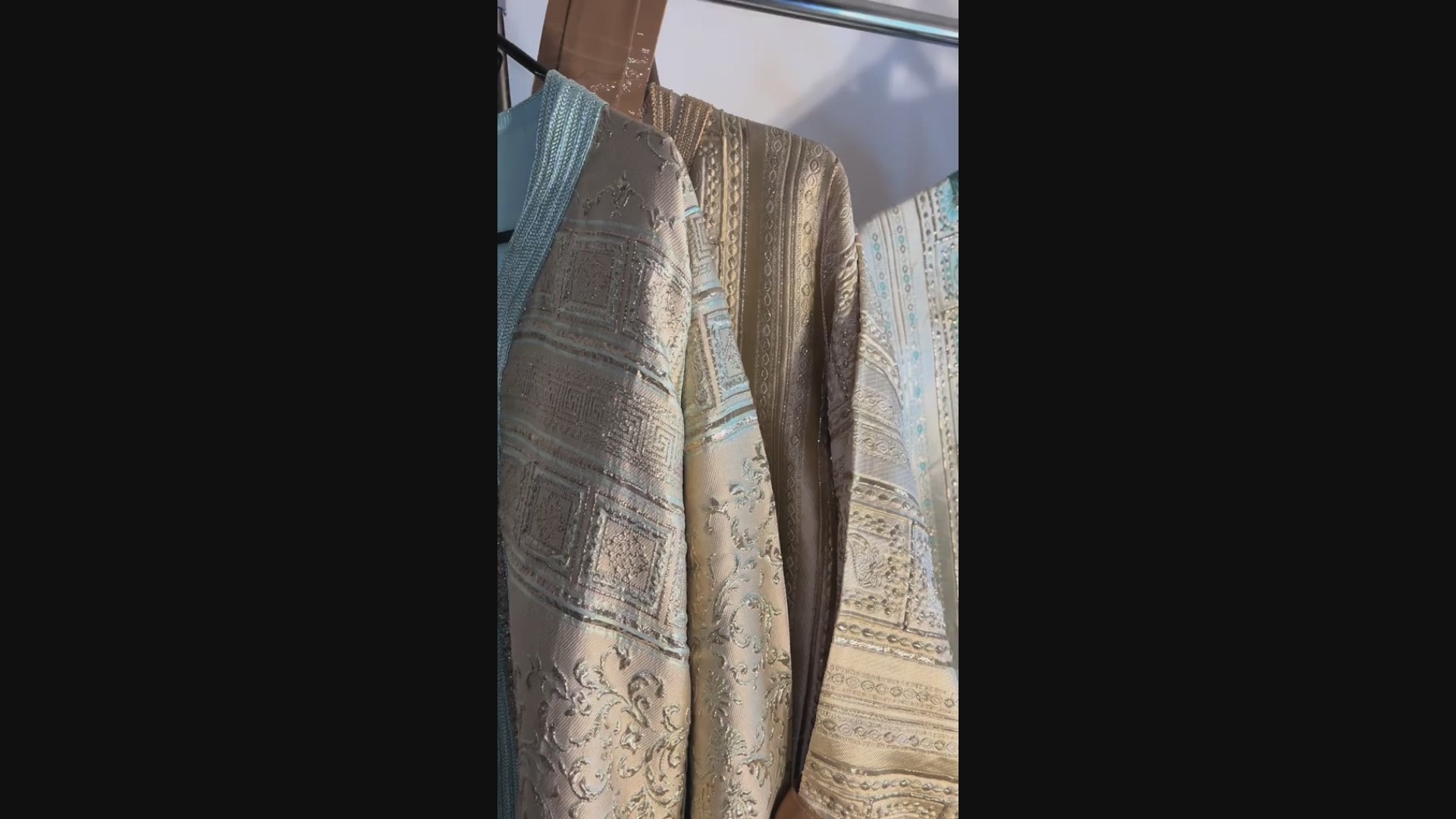 Laissez-vous séduire par l’élégance intemporelle de cette takchita en brocard vert amande et doré, une création signée ZEYNAYA Prestige.